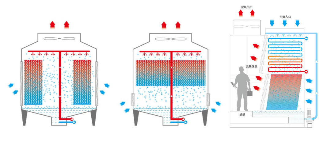 (左,橫流式冷卻水塔示意) (中,逆流式冷卻水塔示意) (右,複合式冷卻水塔示意)